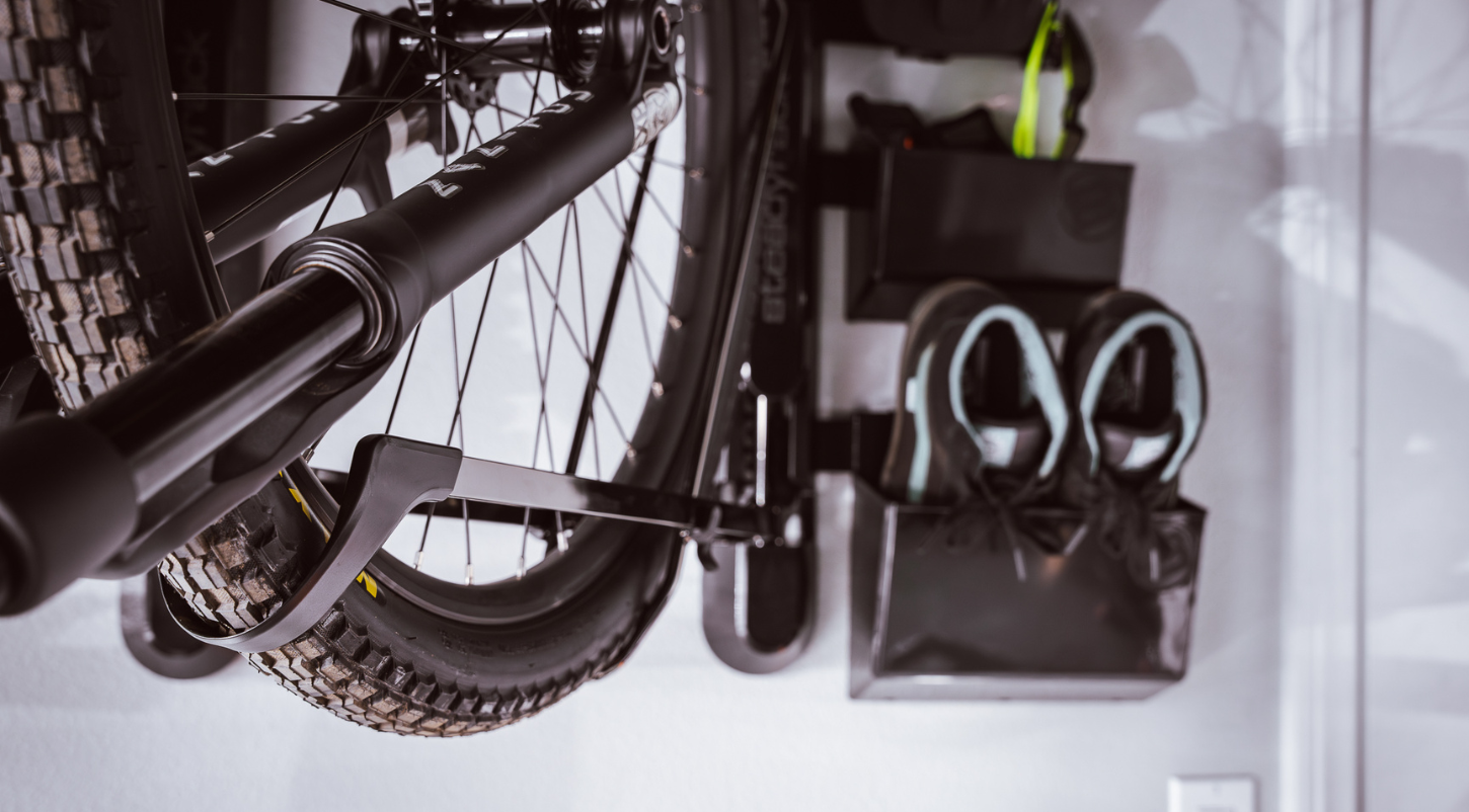 The ProFlex comes with user-friendly end caps that slide-and-click into place for effortless installation. The new SteadyRest is designed to accommodate the increasing width of fat tires, ensuring a secure fit for a range of bikes as well as reduces scuffing on your wall and serves as a pivot point. The inclusion of the dovetail mounting plate makes it an adaptable system for future Steadyrack products. The ProFlex rack also includes the Gearmate SteadySpine, making it compatible with the GearMate system.