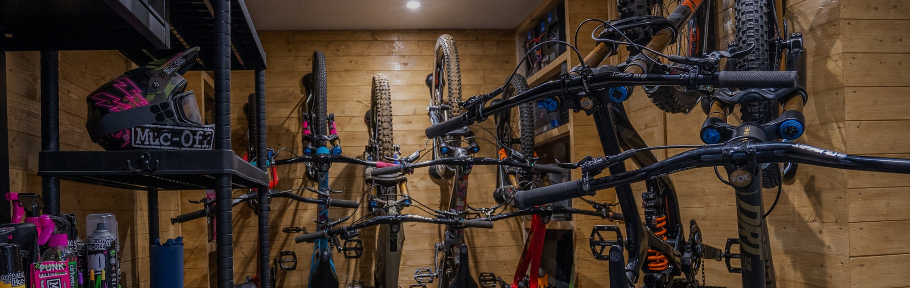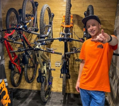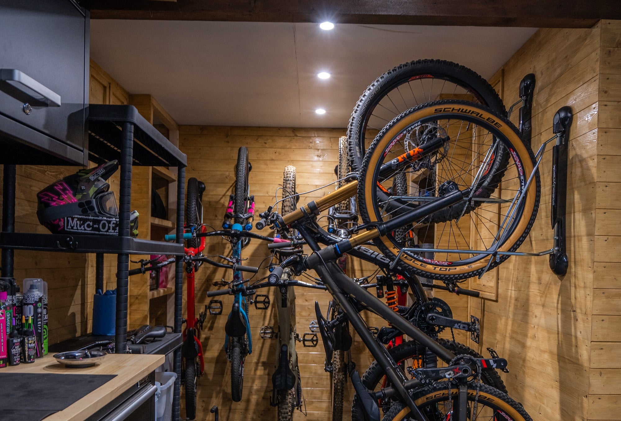 Tom has spaced his bikes 350mm apart and has hung them at alternating heights to get even more bikes into a small space. He has 8 bikes in Steadyracks, 6 on one wall and 2 on the smaller one. Loading his bikes in this manner means he can get more out of a tight space whilst still being able to pivot them side to side to access the bike he wants to ride.